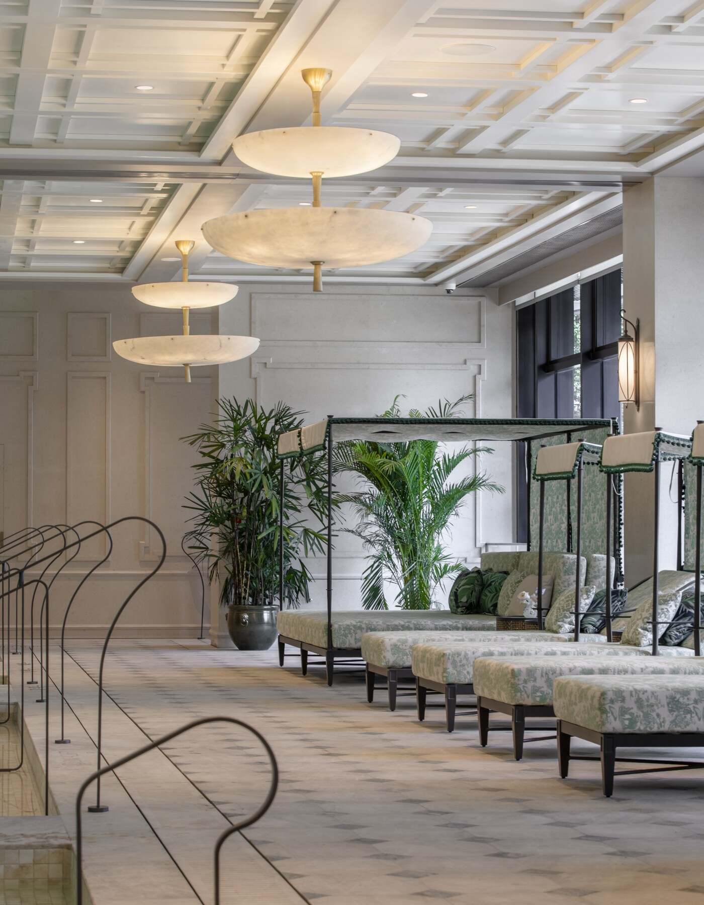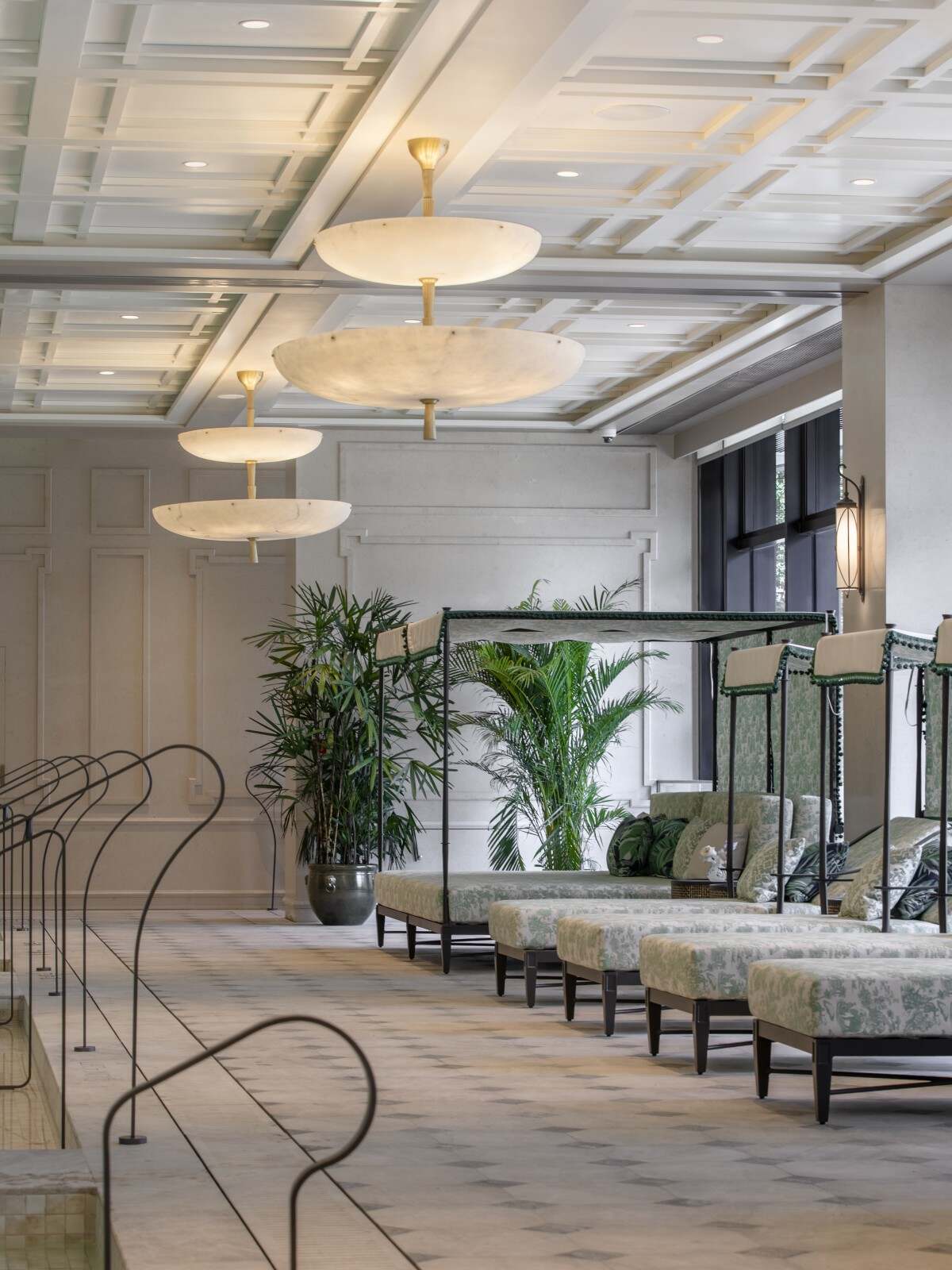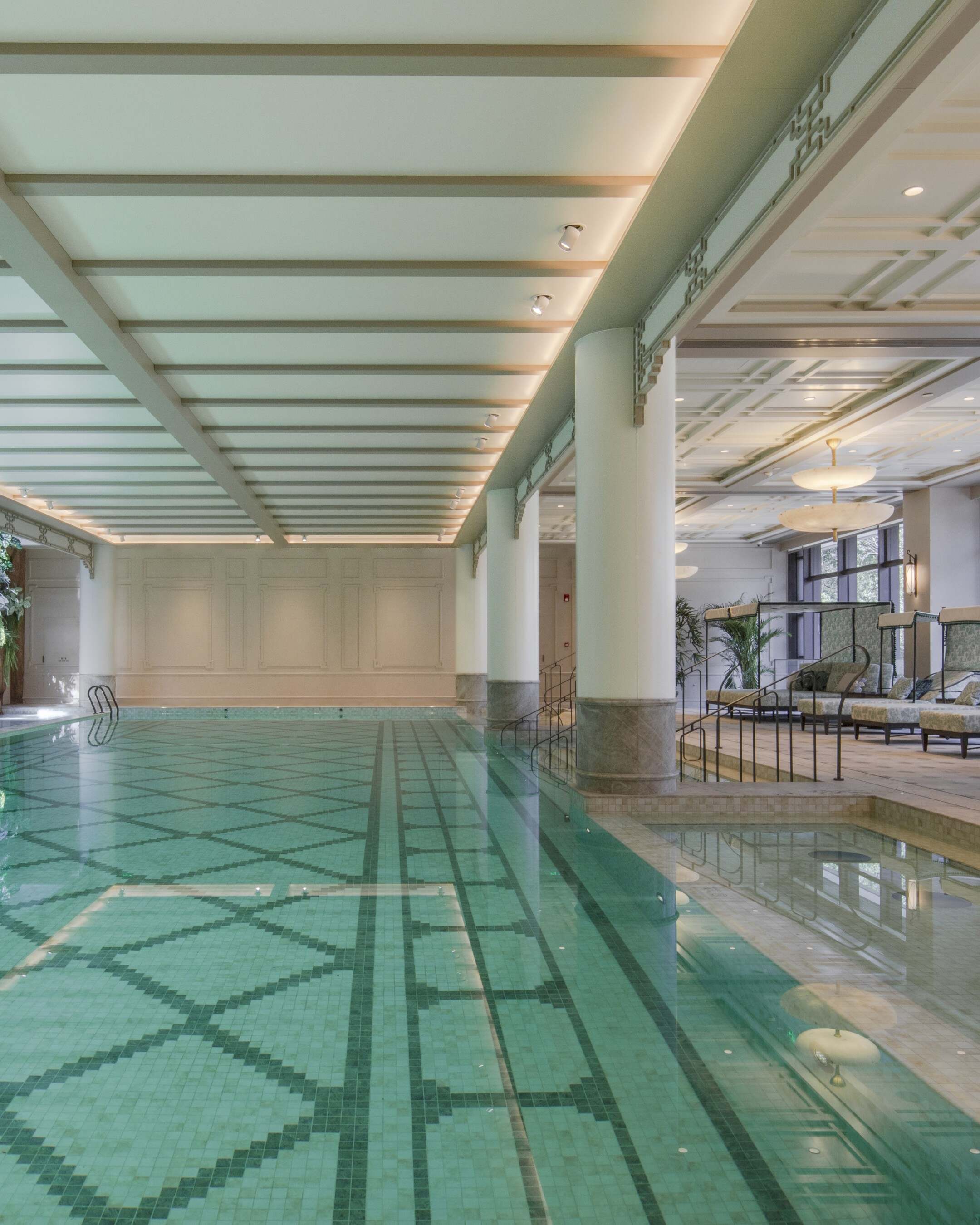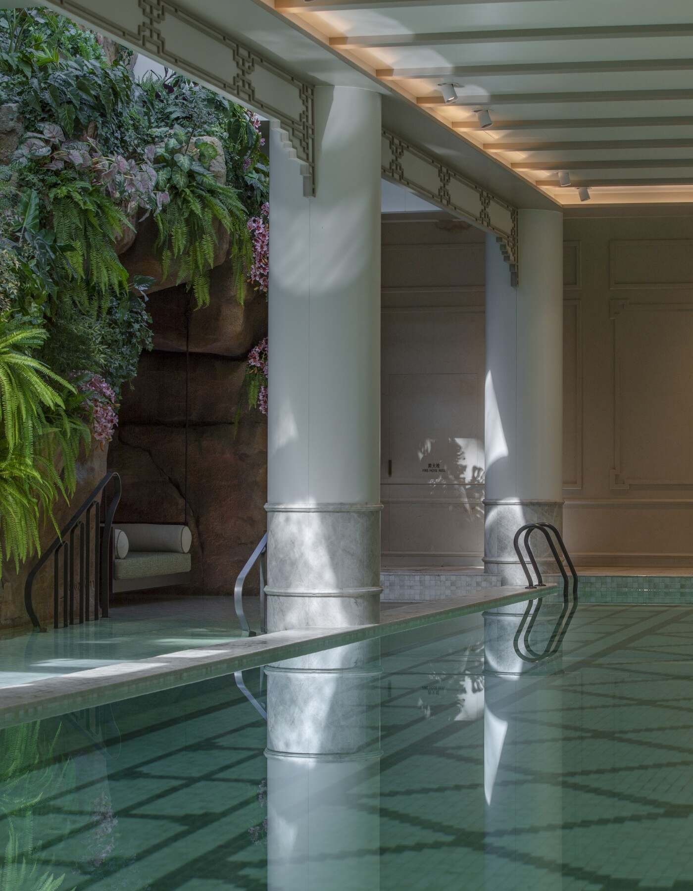 Design by Lázaro Rosa-Violán. The 20-meter-long cliff-style indoor swimming pool, offers a breathtaking blend of nature and architecture. It is complemented by three handcrafted grotto caves, featuring waterfall, hammock, and Jacuzzi style respectively. The ceiling's intricate designs invite natural light, casting a peaceful glow, while stone walls and cascading waterfalls envelop you in tranquility. Expansive glass reveals the mountain's embrace, featuring two camphor trees over 300 years old atop the pool, merging indoor comfort with nature's splendor.
